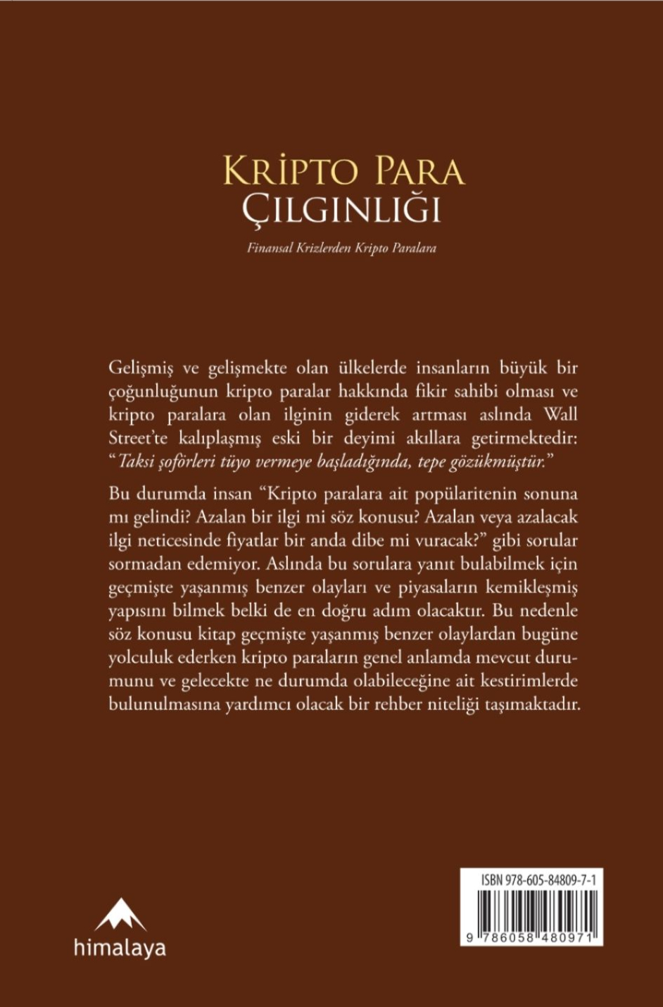 Bu durumda insan “Kripto paralara ait popülaritenin sonuna mı gelindi? Azalan bir ilgi mi söz konusu? Azalan veya azalacak ilgi neticesinde fiyatlar bir anda dibe mi vuracak?” gibi sorular sormadan edemiyor. Aslında bu sorulara yanıt bulabilmek için geçmişte yaşanmış benzer olayları ve piyasaların kemikleşmiş yapısını bilmek belki de en doğru adım olacaktır. Bu nedenle söz konusu kitap geçmişte yaşanmış benzer olaylardan bugüne yolculuk ederken kripto paraların genel anlamda mevcut durumunu ve gelecekte ne durumda olabileceğine ait kestirimlerde bulunulmasına yardımcı olacak bir rehber niteliği taşımaktadır.